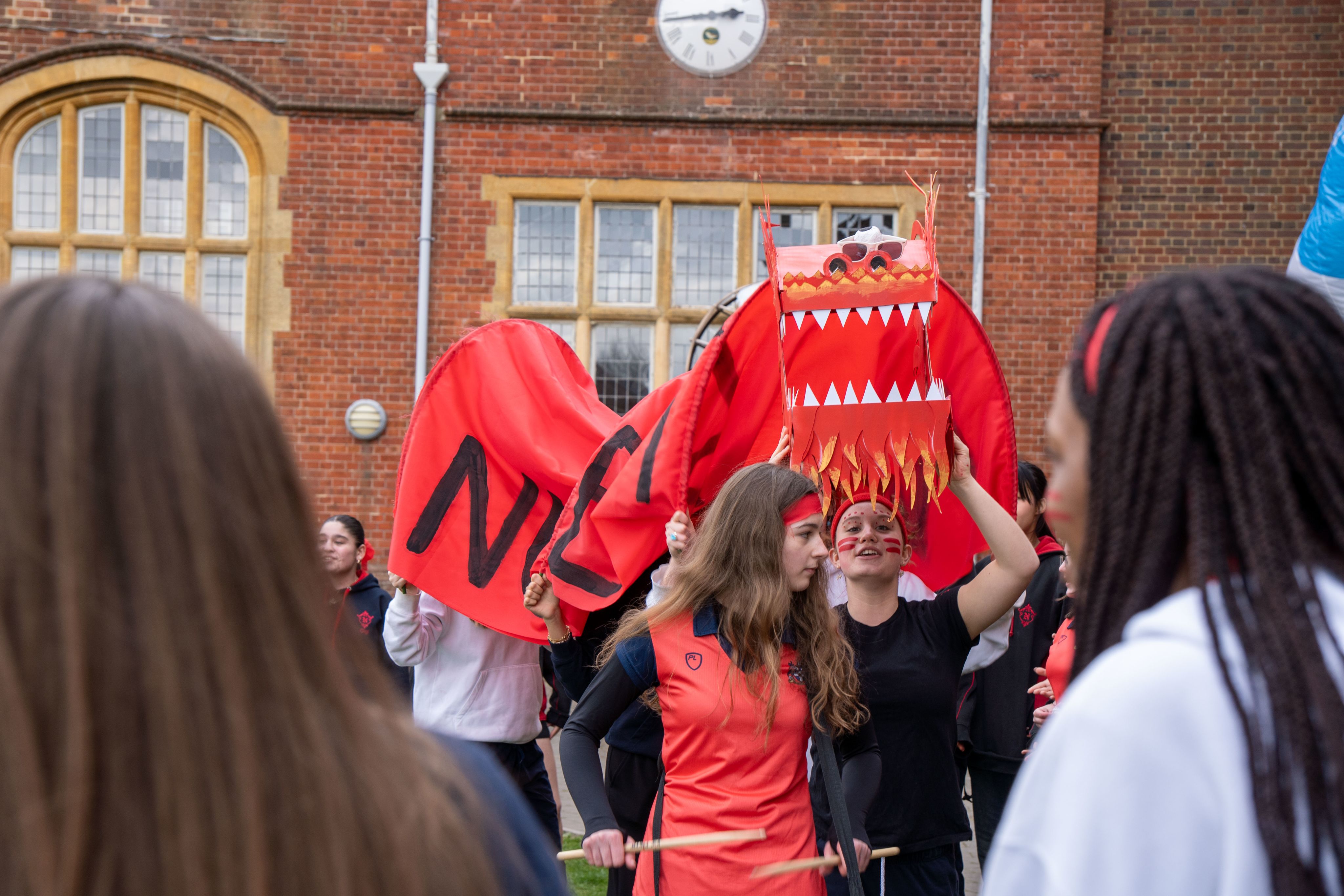 Nugent House girls created a red dragon for the Mardi Gras parade which kicked off the afternoon's fun.